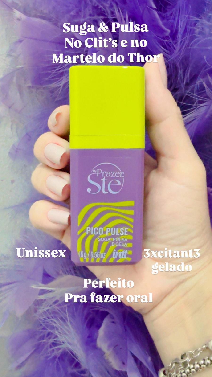 É uma explosão deliciosa de sensações, que só experimentando na região íntima pra entender a intensidade. Ele também pode ser usado na boca pra beijar e fazer oral, porque aumenta muito a salivação.